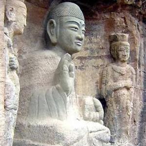 香坊石窟,北魏,延安,黄陵县双龙镇香坊村,石窟寺及题刻,第五批 陕北黄陵县双龙乡香坊村东北约 1 公里处的陈家山崖壁上,保存着一座小型的北朝石窟,称作香坊石窟。它的平面呈方形,平顶敞口,高、宽、进深都在 1.2 米左右。后壁的正中雕了一尊坐佛像,左右两壁的内侧各雕一身胁侍 立菩萨,它们的面部如卵形,身躯饱满,服装的表面刻着排列密集的衣纹线 ...