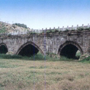 古龙桥位于三原县南北二城之间的清峪河 上,是关中地区现存最完整的一座明代厚墩三联 拱石桥,又称崇仁桥,俗称三眼桥。古龙桥南北 走向,横跨清河上,全长110米,桥面长54.5米, 宽10.95米。此桥设计独特,采用三孔不等跨拱 桥形式,中间一孔大净跨17.5米,两边两孔小 净跨7.4米。为了美观,桥两边孔采用对称半圆 形式,为了增大强度,中孔采用尖拱顶,也叫二 心圆或两 ...