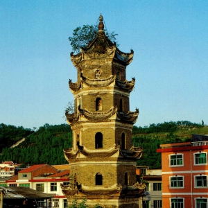 羊山乐宝塔 : 羊山东宝塔。又名“红安寺塔”,位于洵阳县构元镇羊山村,明代正 德年间(1506-1521)建造,为古红安寺遗迹之一。 六棱五级实心砖塔,通高11.02米。通体为仿木结构,每级各面均有 檐头、角脊、斗拱和门窗装饰。构造精巧,古朴大方。是陕南地区古塔建 筑中的精品,具有很高的艺术价值。此塔为陕西省第六批重点文物保护单位。 Yangshan Dongbao Pagoda T ...