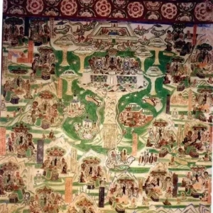 五代 莫高窟61窟南壁壁画 楞伽经变全图 此图绘于公元947—951年间。中央大海部分主要表现佛应罗婆那王之请,上摩罗耶山楞伽城说法,左右两侧的21铺小说法图,是佛以神通力化现的十方佛土,内容或为大意菩萨与释迦佛问答,或为罗婆那王供养释迦佛。下部为“广喻幽旨”与禁断食肉诸故事。构图布局满而不乱。