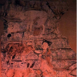 五代 莫高窟61窟南壁壁画 罗婆那王请佛上山与楞伽城说法 此图将罗婆那王请佛上山与释迦佛上山说法的两个场面紧紧相接,使画面更紧凑、情节更明。