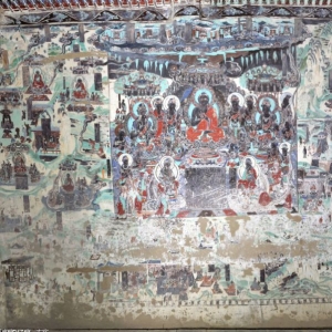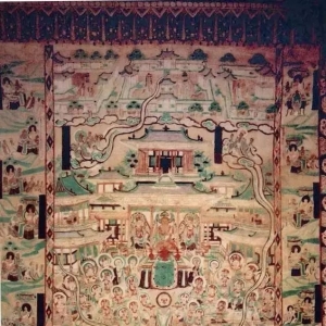 宋 莫高窟55窟北壁壁画 天请问经变全图 属于三栏式构图。中间主联的情节内容及构图布局,大致与莫高窟12窟的相同,只是下部没有屏风画。右边联内画“天请问”小说法图七幅,左边联内画“天请问”小说法图八幅。表现形式雷同。每幅说法图旁有榜题,都是摘抄自《天请司经》。在敦煌壁画中,像这种表现形式的天请问经变仅此一例。