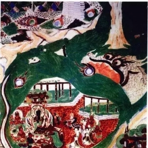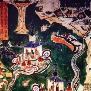 五代 莫高窟61窟南壁壁画 龙宫说法 释迦佛在龙宫为海龙王说法,龙宫四周画龙头与龙女,画面很生动。下部墨书榜题:“世尊于七日,住摩竭海中。然后出龙宫,安详升此岸。”