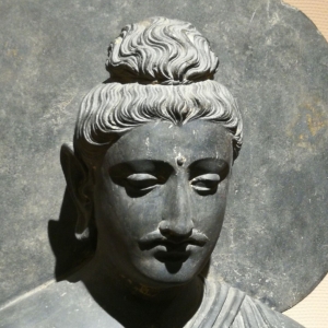 佛陀坐像公元2世纪本件为典型的犍陀罗最盛期的精美佛像,有着希腊风格的波浪发髻和流畅的衣纹。佛陀面部祥和,充满睿智,做禅定印,结跏趺坐于狮子座上,台座中央雕刻有弥勒菩萨,周围有众多的供养者。台座的两端雕刻着雄壮的狮子,其正畅饮着仙女端来的葡萄美酒。通体残留有少许金箔。虽然佛像的鼻子和手指有少许修复,但如此高大精美的犍陀罗雕像实在不多,本件堪称犍陀罗佛像之极品。在巴基斯坦白沙瓦博物馆也有一件类似的精美