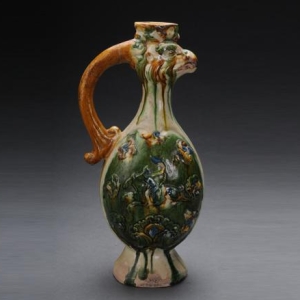 唐三彩凤首壶,陶器,唐代,高32厘米,腹围40厘米。1965年河南洛阳东郊塔湾村出土。现藏河南博物院。凤首壶是唐代陶瓷器中新出现的造型,这件唐三彩凤首壶,壶身修长,椭圆形口,颈上部塑一凤首,高耸的凤冠为壶口。凤嘴张开,口衔珠,象征壶的流部。壶腹呈椭圆形,下有喇叭形高足。肩腹与凤首部分有一如意形粗柄。壶腹两面纹饰不同,除浮雕忍冬花和海石榴 ...