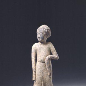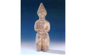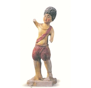 昆仑人陶俑唐高28厘米传陕西省西安市出土此俑1949年霍明志先生捐赠。卷发,上身仅斜披一巾,戴项圈腕钏,下身股际缠裈,赤足;右手紧握高举,左手握拳屈于腰间,双手原有执物,似做表演状。昆仑这个名称早在三国时已有记载,指色黑之人,而非指人类学上的黑种人,也非指一国一族。《晋书·孝武李太后传》:“时后为宫人,在织坊中,形长而色黑,宫人皆谓之 ...