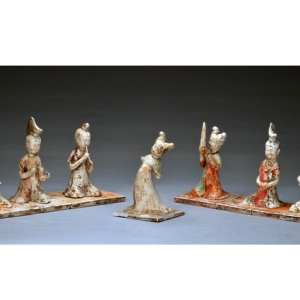 北窑湾唐墓出土绘彩伎乐俑一组(7件),唐代。俑高13.0-17.0厘米;底板长36.1厘米、宽11.6厘米。1992年11月河南巩义市北窑湾唐墓出土,现藏河南省文物考古研究院。