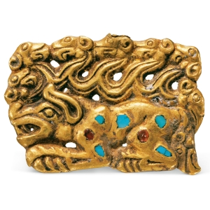 嵌宝石绿松石兽纹金饰牌战国(公元前403—前221年)长4.6厘米,宽3厘米,重22.25克1972年内蒙古伊克昭盟杭锦旗阿鲁柴登出土 金饰牌正面为虎、鸟图案。其以虎形图案为 主,张口露牙,四肢前屈,身上镶嵌红宝石和绿 松石七块。在虎的身上及尾部,有群鸟图案,八 只成排,鸟身简化为S型。背面两端各有桥形钮。 就其造型来看,该金饰可能为带饰。 ...