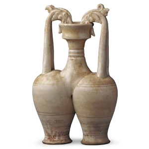 白釉印花兽面纹双系扁壶隋(公元581—618年)高8.8厘米,口径2.5厘米,足径4厘米1957年陕西西安梁家庄隋李静训墓出土 圆口,短束颈,扁弧腹,外撇圈足。此类扁壶是北朝出现的新器形,其造型特征是杏核形壶腹,肩附双系,壶腹两面模印相同纹样,一般在联珠纹围成的开光中印胡人、兽面、凤等主题纹饰。从其造型、纹饰内容看,这种扁壶的出现是外来文化传播的 ...