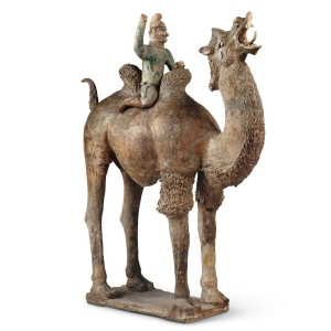 绿釉胡人骑驼陶俑唐(公元618—907年)俑高41.6厘米,骆驼高113厘米,长88.7厘米1956年陕西西安独孤思敬墓出土 胎质高岭土,灰白细腻,分体模制,后雕琢组装。双峰驼施灰绿釉,瞠目挺颈,口扩,作卷舌嘶鸣状,鬃浓密,尾上翘。上乘一绿釉胡人俑,高鼻朱唇,颌下须连鬓;戴黑幞头,身着圆口短袄,腰间挂一香囊,长裤缚于筒靴内,右臂举鞭,再现了胡人驱驼行 ...