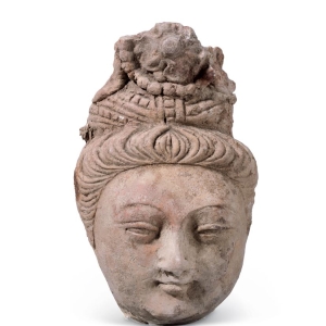 彩塑菩萨头像6-7世纪高20厘米,宽12厘米1928年新疆焉耆七个星明屋发现菩萨头束发, 发髻正面饰花。面部略显丰满, 长眉、细眼, 高鼻,小口,五官集中于面部中央,面带微笑。
