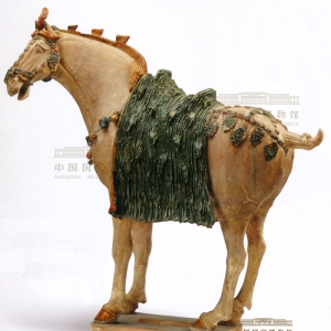 三彩陶三花马唐 开元十一年(公元723年)高54.6厘米,首尾长54.5厘米1957年陕西西安鲜于廉墓出土马头向左侧视,通身白色,鬃上剪三花,马鞍上披着深绿色绒毯状鞍袱,胸前和鞍后均络绿色革带。胸前的带上饰有黄色小铃(金铃),金铃间饰有黄点的蓝色流苏;鞍后皮带两侧各饰杏叶形垂饰5枚,革带交结尻上,交结处饰有杏叶形垂饰4枚。头上辔饰俱全,嘴角两侧带 ...