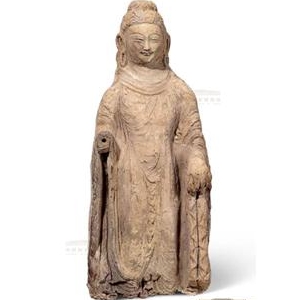 彩塑佛立像5-6世纪高43.5厘米,宽18厘米1928年新疆焉耆七个星明屋发现此尊佛像发髻为大波浪纹,面颊丰颐,曲眉秀目,高鼻、纤口, 双耳长垂。身穿通肩大衣,衣纹简洁流畅,衣质轻薄,有丝绸般质感。佛像身体轮廓清晰,姿态优雅。