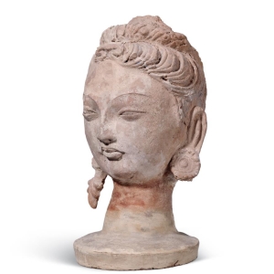 彩塑菩萨头像6-7世纪高28厘米,宽13厘米1928年新疆焉耆七个星明屋发现此头像发髻为大波浪纹,圆脸,眉、眼细长,双耳饰花式耳环。