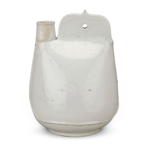 白釉马镫壶五代(公元907—960年)高26.3厘米,口径3.9厘米,足径11.5厘米1953年内蒙古赤峰大营子辽墓出土 马镫壶,又称皮囊壶或鸡冠壶,因造型似马镫而得名,是极具游牧色彩的契丹族生活用器。唐末五代,契丹族通过与中原的交往掌握了制瓷技术,仿照本民族用来盛放液体的皮囊制作了最早的马镫壶。此时契丹族还处于游牧生活状态,在追逐水草的迁徙过程中需 ...