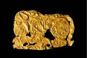 战国清水县刘坪出土长8.4厘米;-8.5厘米,宽5.5-5.7厘米。工艺技法采用常见的锤碟法,在薄的金片的背面錾刻虎形,正面隆起,边缘剪切,四角有钉孔。虎呈蹲踞形,眼、鼻、耳、嘴、齿、爪都十分清晰,虎张嘴,伸沟状前爪抓住一羊。