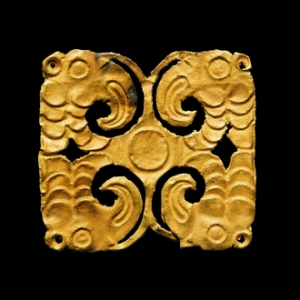 盘龙纹金饰片是战国时期的一件文物,现收藏于甘肃省博物馆。纵5.3-5.7厘米,横4.3-4.7厘米。系薄金片锤碟呈蝶形,两条龙交叉盘绕,龙首一侧饰两条小龙,龙首一侧饰一小虎,作咬噬龙尾状。龙身饰连珠纹,上部边缘有钉孔两个,下部边缘有钉孔一个。动物纠结的纹样源自鄂尔多斯。但龙头图案化十分明显,与中原地区的龙头表现方法基本一致。 ...