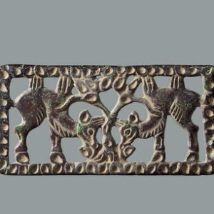 甘肃省博物馆收藏的文物青铜镂空双驼饰牌是甘肃省博物馆收藏的一件文物,出土于甘肃民勤,是一件国宝级文物 。制作于战国至西汉时期,为当时活动于河西走廊的匈奴人所使用 。饰牌呈长方形,采用镂空铸造工艺,主体图案为一对骆驼。边框饰以连珠点,构图对称,图案描绘了双驼在草原低头吃草的场景 。它直接反映了匈奴人的草原生活,其用途可能为腰带饰、带 ...