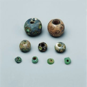 蜻蜓眼琉璃珠是战国时期具有典型特征的玻璃装饰品,1974年出土于甘肃省平凉市战国秦墓群,共发现57枚,其中16枚用作佩饰、41枚用于兵器装饰。该文物采用古埃及传入的同心圆镶嵌工艺,结合中国独创的氧化铅钡配方,形成白蓝相间的鱼目纹结构,直径多在1-2厘米之间,代表战国晚期玻璃工艺高峰。其纹饰演变从圆形发展到管状、片状等多种形态,纹样融合花瓣形 ...
