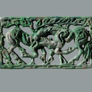 透雕双马咬斗青铜方形饰牌战国时期的文物透雕双马咬斗青铜方形饰牌为战国时期青铜器,出土于甘肃定西县葛家岔,现藏甘肃省博物馆 。器物长7厘米、宽3厘米,主体呈方形。上古时期,人类对马的驯养和使用对发展交通、扩大交往发挥了作用 。采用透雕技法雕刻双马咬斗场景:右马咬住左马后脖颈,左马口含右马左前腿,构图简洁生动,边框为意象化不规则树枝构架 ...