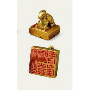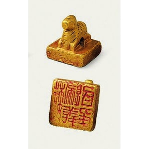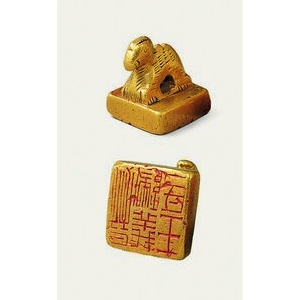 甘肃省博物馆馆藏文物晋“晋归义羌侯”金印是西晋时期中央王朝颁赐给羌族首领的金质官印,现藏于甘肃省博物馆。该印通高3厘米,印面边长2.3厘米,重94克,采用黄金铸造,驼钮呈跪姿造型,属典型的少数民族首领印型。印面为方形,凿刻篆体阴文“晋归义羌侯”五字,采用三行布局,其中“晋”字独占一行,字体方正严谨,体现晋代官印文字风格。此印1962年出土 ...