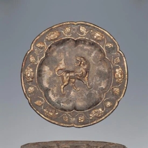 狮子纹三足鎏金银盘 西安出土葵口三足狮子纹鎏金银盘唐(公元618年—907年)高6.7厘米,口径40厘米1956年陕西西安八府庄东北出土 银盘作葵瓣形,下面附有浇铸的卷叶形三足,盘中饰一回头嘶吼的狮子,宽边沿,盘缘饰牡丹花纹,正是盛唐时期金花银盘所具有的特征。 唐代银盘发现甚多,其中带足者有10件之多,多数是三足,少数为四足,保存完好的都是 卷曲式 ...