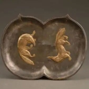 又名: 鎏金双狐纹双桃形银盘所属年代:唐朝1970年西安市南郊何家村出土。盘身为相连的双桃形,浅腹、平底,窄平折沿,锤击成型,纹饰涂金。两个桃形盘中心以模冲法冲出两只首尾错置、相互顾盼的狐狸,造型极为生动。这件银盘在制作上采用了唐代金银器制作工艺中常用的两种制作方法,即捶揲法和鎏金法。银盘为双桃相连形,在两桃盘底各捶揲出一只行走的狐狸 ...