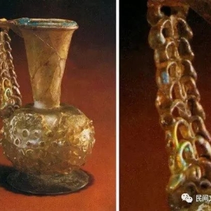 河南洛阳的一座东汉墓出土的缠丝玻璃瓶。这种玻璃瓶不仅器形与中国传统器形不同,其成型方法也和中国汉代玻璃器截然不同,它是采用吹制法制作成形的。