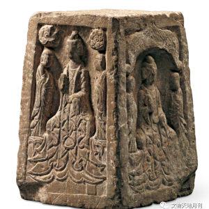 北魏 佛、弟子石造佛塔 北魏佛、弟子石造佛塔,1996年隆德县神林乡出土,宁夏固原博物馆馆藏。红沙岩石质。整体为梯形,四面开龛造像,其中相对两龛平顶,左右上角分别雕有莲花装饰,另相对两龛均为火焰纹拱形龛。四龛造像均为一佛二弟子,中佛高发髻,结跏趺坐,弟子站立两侧。其中两佛龛佛作说法印,另两佛龛佛施禅定印。佛面相清秀,高肉髻 ...
