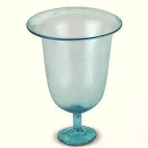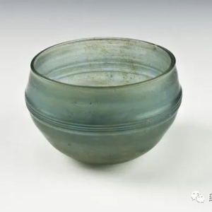 淡蓝色高脚玻璃杯 内蒙古吐尔基山辽墓出土 此杯历经千年依然不惹尘埃,晶莹剔透,是内蒙古地区现在发现的保存最好、质地最优的古代玻璃杯 。敛口,弧腹,自腰下内收,小平底,腹部饰三道弦纹。