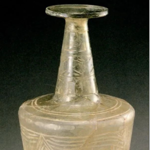 玻璃长颈瓶,辽,陈国公主驸马合葬墓出土,高25.2厘米、器身宽7厘米。来自伊朗地区9世纪的产品。