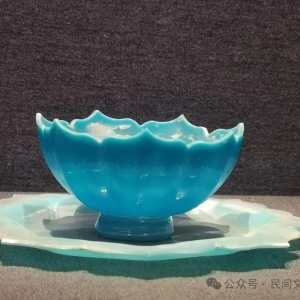 元代玻璃莲花托盏 盏高4.9厘米,口径8.9厘米,底径3.4厘米 盏托高1.2厘米,口径15.2厘米。甘肃省博物馆藏· 玻璃托盏为晋蓝色玻璃制成,半透明,胎内含气泡。盏为七瓣莲花形,饼形足;托口为平口,边沿呈八瓣莲花形,平底,腹壁呈正八角形。中国元代出土的玻璃器皿较少,这件托盏造型优美,色彩艳丽,工艺精湛,是迄今出土最完整的一套元代玻璃托盏。 . ...