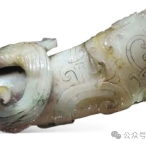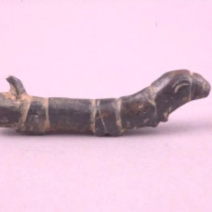 长5.1cm,重200克,体呈竹节状,竹节处有并排双短足,头部翘起,嘴呈圆锥形,双目微开,尾巴部上短有一钩,钩尖向后。1974年西安市北郊大白杨征集,现藏于西安博物院。