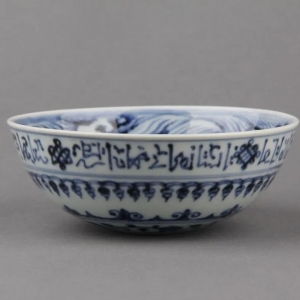 青花阿拉伯文碗高4.4厘米,口径13.3厘米足径3.8厘米,重0.18千克1983年西安市文物管理委员会征集现藏西安博物院青花阿拉伯文碗纹饰作为一种装饰艺术和文化现象,多为表达吉祥如意或蕴含着美好的祝福,和当时的社会风俗、审美情趣和社会发展水平密不可分。这件青花碗,年代属于明永乐时期,碗口微敛,弧形腹,卧足。釉质细腻,胎体轻薄,形制规整,画面十分 ...