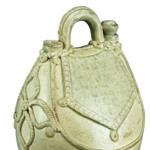 唐白釉皮囊壶高20厘米,重1.12千克1964年出土于西安市东郊沙坡村NO.1白釉皮囊壶皮囊壶,壶的一种样式。因形如皮革缝制的水囊,故名。仿皮袋造型,器身上扁下肥,鼓成皮袋状,有仿皮革凸起的缝线,前端附筒状流,上安提梁,有白瓷、彩色釉陶等制品。小口,下腹圆鼓,假圈足,足径较大,半圆形短提梁,壶腹上部堆贴有浮雕式鞍形饰,模仿出鞍具上所铺毡毯,其 ...
