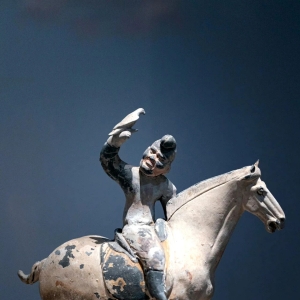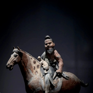 抱犬狩猎胡俑,通高35.5厘米,马长33.5厘米。张口露齿,作呐喊状的胡俑,头戴黑色幞头,高鼻深目,怀抱白色猎犬,左手紧握缰绳似侦听周围动静。尖嘴、细身、长尾的猎犬,疑似唐朝的“波斯犬”,“波斯犬”紧贴主人胸腹前,竖耳抬头,机警地注视着前方,红色大马则昂首直立,这件作品把胡人粗犷剽悍的个性刻画得淋漓尽致。 ... ...