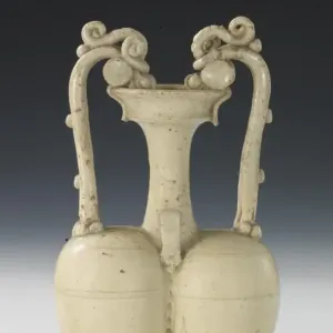 白釉双龙柄联腹传瓶高19厘米,口径4.6厘米。此器两腹相联,连接处伸一杯式口,肩部塑对称龙形柄,白胎白釉,釉面有细小裂纹,属于隋唐时期供贵族使用的随葬器物,形制上可能源于本土盘口瓶,并借鉴了西域双柄银壶的装饰特征。反映了北朝至隋代文化交流的活跃,代表了隋代白瓷的最高水平。 ... ... ...