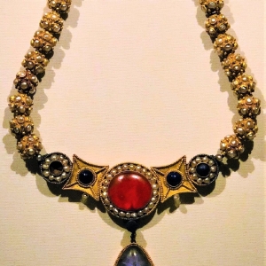 嵌珍珠宝石金项链通体用黄金打造,两侧的28颗金珠如星辰错落,每颗由十二枚金环焊接成空心多面体,嵌珍珠十颗,光华流转。顶端一枚深蓝色青金石圆纽,凹雕一只花角鹿,下端的蓝色宝石晶莹温润,24颗珍珠环绕的红色宝石,好似落日熔金。
