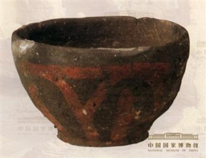 朱绘陶碗唐高9.5厘米,口径15.3厘米,底径8厘米新疆维吾尔自治区出土此陶碗为青灰地,直口渐向内收,底部为小圈足。口部稍下绘朱色一圈,其下绘人字形及不规则朱色粗线条。其表里皆有白色斑点,系原料不纯,杂有沙粒所致。