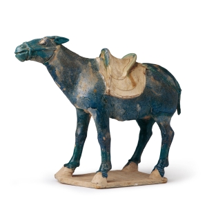 蓝釉陶驴唐高23.5厘米,长26.5厘米1956年陕西省西安市小土门出土陶驴全身施蓝釉,鞍鞯勒饰俱全。形态生动,虽未提腿扬蹄,但它那昂首的姿态及抖擞的精神,似乎正引颈长嘶,备鞍待发。 最为珍贵的是它全身施蓝釉。在唐代三彩陶器中,黄、绿、白三种釉色最为常见,蓝釉器则少见,蓝釉俑就更少。蓝釉出现于盛唐时期,其氧化呈色金属主要是钴。唐三彩中蓝釉的 ...