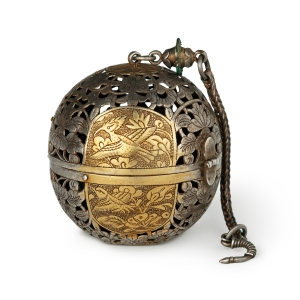鎏金银香囊唐直径4.8厘米1963年陕西省西安市东南郊沙坡村窖藏出土该香囊由两个半球组成,有子母口可以扣合。下半球内装有两个同心圆机环和一个盛放香料的香盂。大的机环与外层球壁连接,小机环分别与大机环和香盂相连。使用时,由于香盂本身的重力作用和两个同心圆机环的机械平衡,无论香囊如何滚动,里面的香盂都可以保持水平状态,香料不会倾撒。香囊外 ...