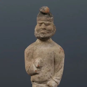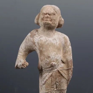 唐彩绘陶牵驼胡俑 西安市东郊唐代金乡县主墓出土 现藏西安博物院唐彩绘陶牵驼胡俑,高40.5厘米。1991年西安市东郊唐代金乡县主墓出土,现藏于西安博物院。胡人高鼻深目,秃顶,络腮胡,脑后有略长的卷发。身着袒胸露腹的翻毛长袍,腰系褡裢,足蹬高靴。双袖捋起,双臂作拉缰牵索状。 ... ...
