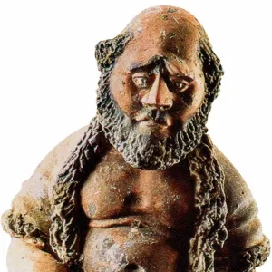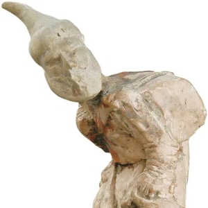 贴金彩绘执贝蠡乐伎俑 隋代 俑高33厘米 乐伎俑位于石床前右侧前二,乐俑身着圆领紧袖,左衽束腰长袍,头戴高角软巾,深目高鼻,一派胡人打扮,跪坐姿势,双手执贝蠡,作吹奏状。
