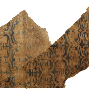 对狮对象牵驼人物纹锦北朝|平纹经锦长39,宽19(单位:厘米)中国丝绸博物馆藏