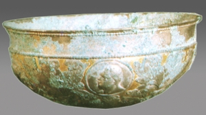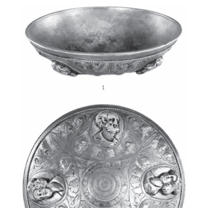 伊和淖尔M1出土的这件鎏金银碗(以下简称“伊和淖尔银碗”),口径14.2厘米,高4厘米。形制为敞口、弧腹、圜底。碗内部素面,外部装饰繁复。即:口沿以下饰联珠纹一周,其下錾刻四组“阿堪突斯”(acanthus) 叶纹,将腹壁四等分,每一等分内的主题纹饰为一椭圆形框架内刻画出的一个西方人头像,四组共三女一男,两两相对。人物皆深目高鼻,但发式各不相同 ...