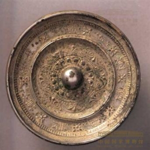 宝相花重轮铜镜唐直径10.3厘米,厚1厘米新疆维吾尔自治区哈密县出土这件铜镜背面的两重突起处有年轮花纹,两轮间铭文“花净月澄宝相花铜镜”,中有圆钮座,可穿绳悬挂。这种宝相花铭带镜,一般流行于隋和唐初。据文献记载,当时扬州生产这种铜镜并进贡给朝廷。这面镜当是从内地传到新疆少数民族地区,反映了汉族与少数民族间的经济文化交流。 ...