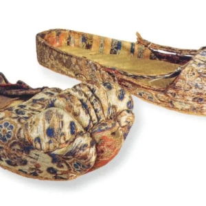锦鞋 唐 吐鲁番阿斯塔那墓地M381出土(《新疆文物的文创元素》P189) 变体宝相花纹云头锦鞋,是1972年阿斯塔那381号墓出土。这双云头锦鞋做工精美,用材讲究,布局合理。鞋面是用黄、蓝、绿、茶青四色丝线织成的变体宝相花纹。这双云头锦鞋将唐代中期的织锦、配色、显花三者有机结合,使得鞋子更具立体饱满、精巧玲珑,体现了华美的艺术风格,是唐代 ...