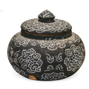 彩绘宝相花小木罐 唐 吐鲁番阿斯塔那墓地M230出土(《新疆文物的文创元素》P137) 彩绘宝相花纹小木罐,1972年吐鲁番阿斯塔那230号墓出土。时代为唐代。通高7厘米。罐身绘宝相花纹和云纹,宝相花朵朵绽开,花间飘着云彩,恍如天上仙境。白色图案用黑地衬托,反差强烈。图案线条流畅,布局合理,错落有致。 ...