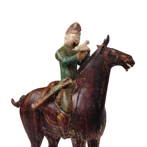 三彩绞釉陶狩猎骑俑唐高37厘米,长27厘米1972年陕西乾县懿德太子墓出土此俑右手擎鹰,左手持食,目光专注,神情逼真,马鞍后置一猎物。唐代政府设有养鹰坊,有专门负责驯养的人员,贵族官僚也是如此。懿德太子墓中除此件饲鹰骑俑外,甬道壁画中还绘有几个擎鹰牵犬的内监。绞胎是唐代出现的陶器新工艺,一般多用作器皿,绞胎俑则极罕见。狩猎是唐代贵族时兴 ...