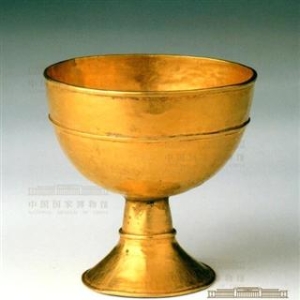 高足金杯隋高5.7厘米,口径5.7厘米,重49.4克1957年陕西省西安市李静训墓出土此金杯为大口,口沿外翻,上有凸弦纹一周,系用一圆环焊上。其下为高足,中空,作喇叭状,足柄及底缘亦各有焊上的凸弦纹一周。足柄上端先粘焊一圆片,然后再焊合于杯身。 ... ...